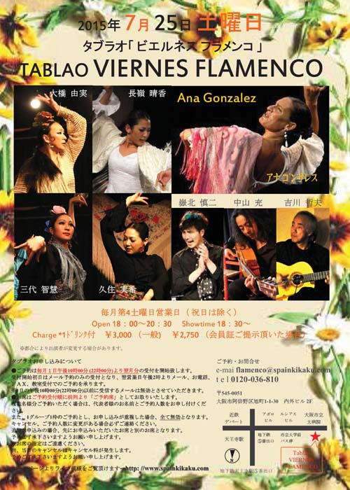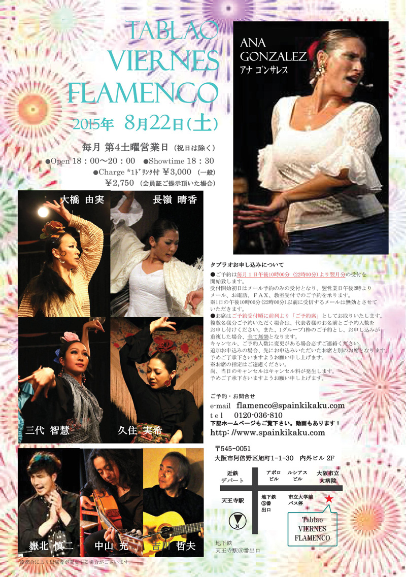 TABLAO VIERNES FLAMENCO 2015年8月22日(土) Open : 18:00 / Start : 18:30 Charge : ¥3,000- ※1Drink付 場所 : ビエルネス フラメンコ |