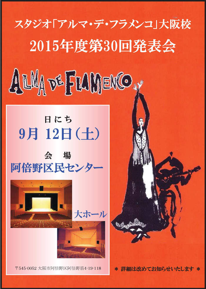 アルマデフラメンコ大阪校「第30回発表会」 2015年9月12日(土) ※開演時間等詳細は後日発表 場所 : 大阪市立阿倍野区民センター (大ホール) |