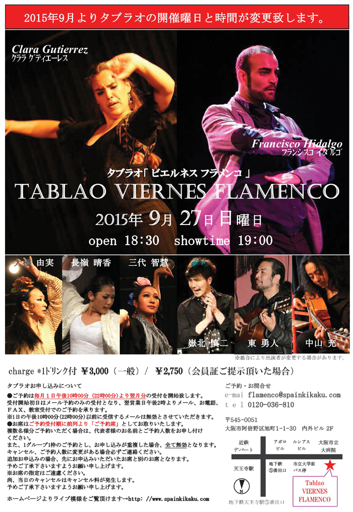 TABLAO VIERNES FLAMENCO 2015年9月27日(日) Open : 18:30 / Start : 19:00 Charge : ¥3,000- ※1Drink付 場所 : ビエルネス フラメンコ |